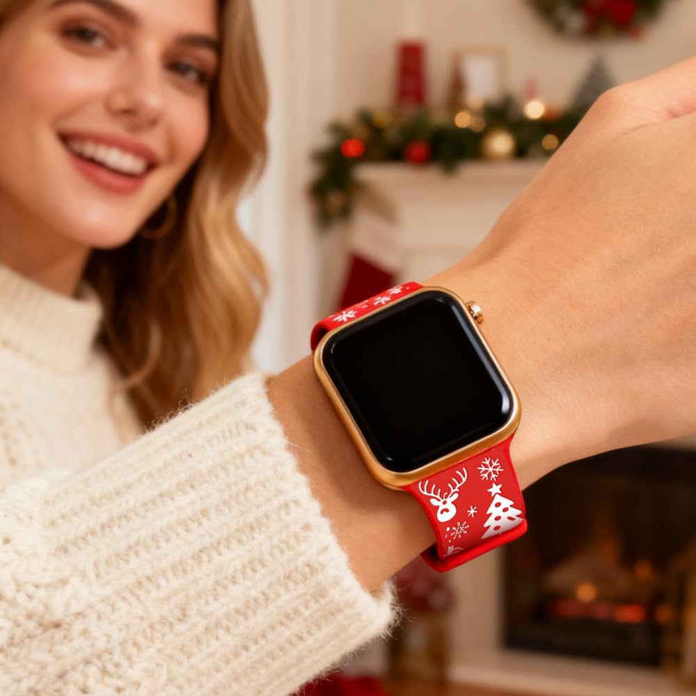 A soft silicone Apple Watch band with festive 3D laser-engraved holiday motifs. Lightweight, comfortable, and designed with a secure butterfly clasp, it brings the warmth of Christmas into your everyday style. Elegant colors like White-Red, White-Pine Green, and Red-Green make it the perfect holiday upgrade.