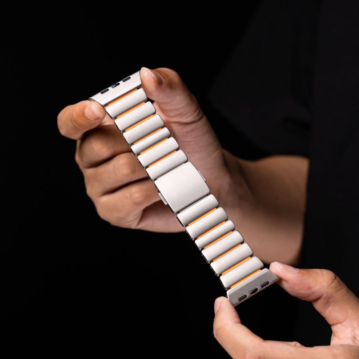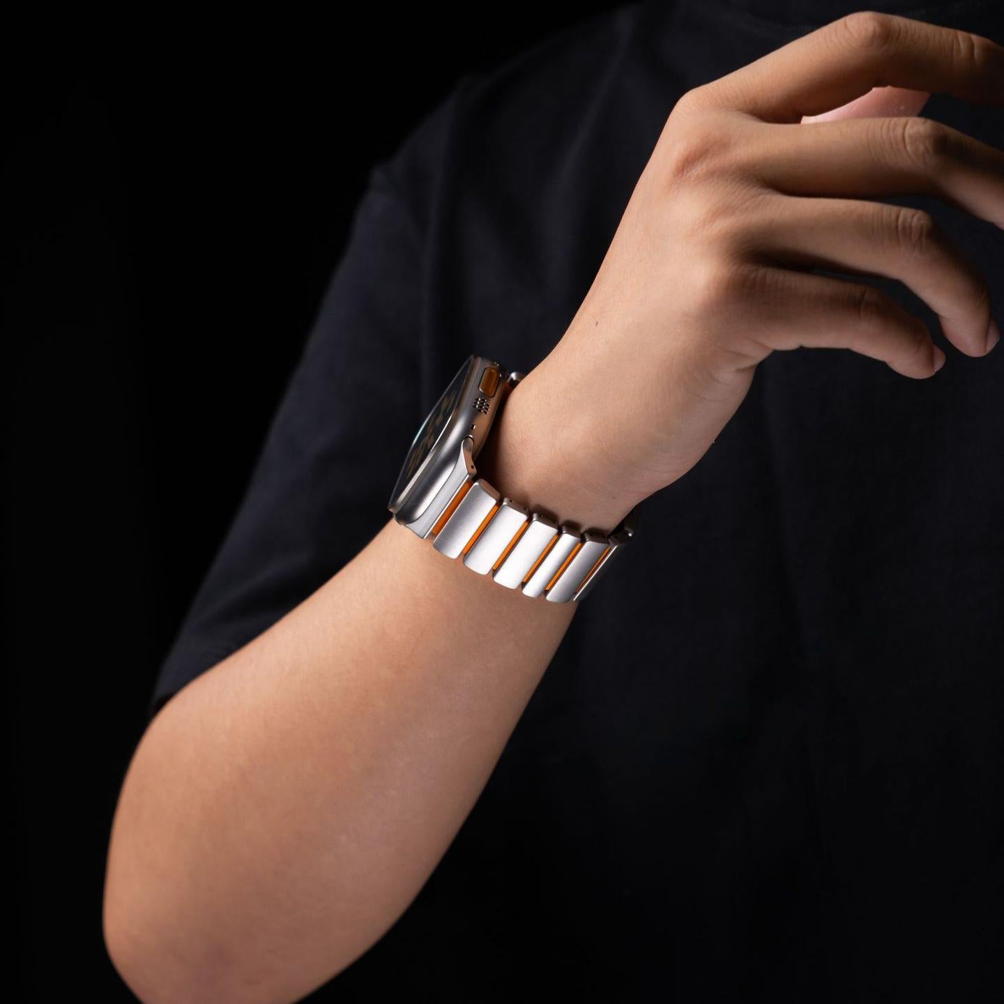 Hybrid metal and rubber Apple Watch band with DLC coating — 22% lighter, 4× tougher, and 99% resistant to moisture and scratches. Elegant yet durable, perfect for business or everyday wear.