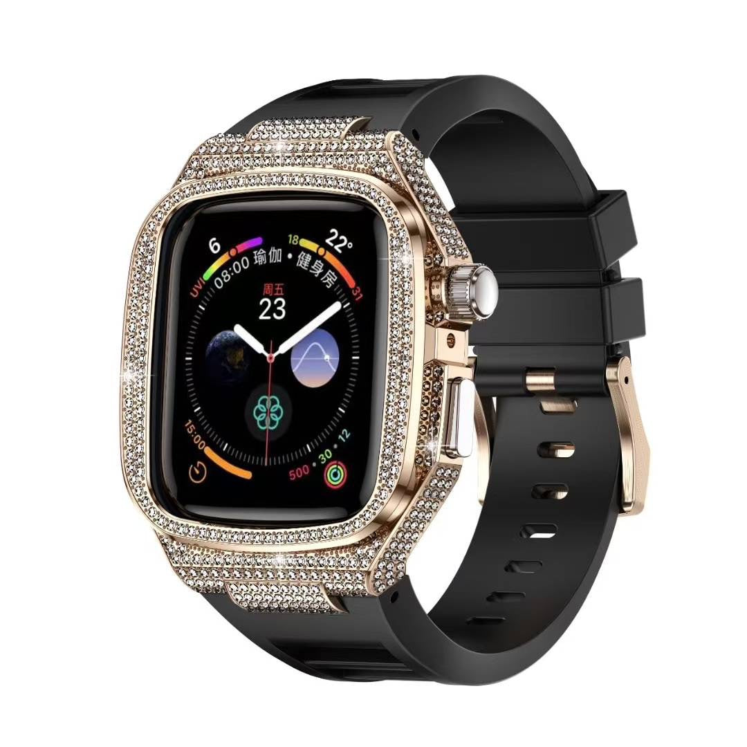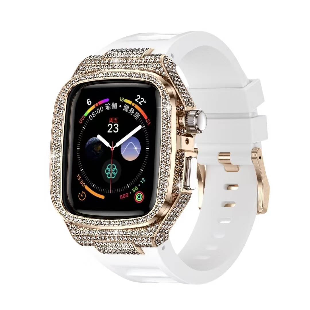This luxury diamond-embedded metal case paired with a soft liquid silicone band transforms your Apple Watch into a bold fashion statement. Designed for comfort and crafted for style, it delivers sparkling elegance with everyday practicality.